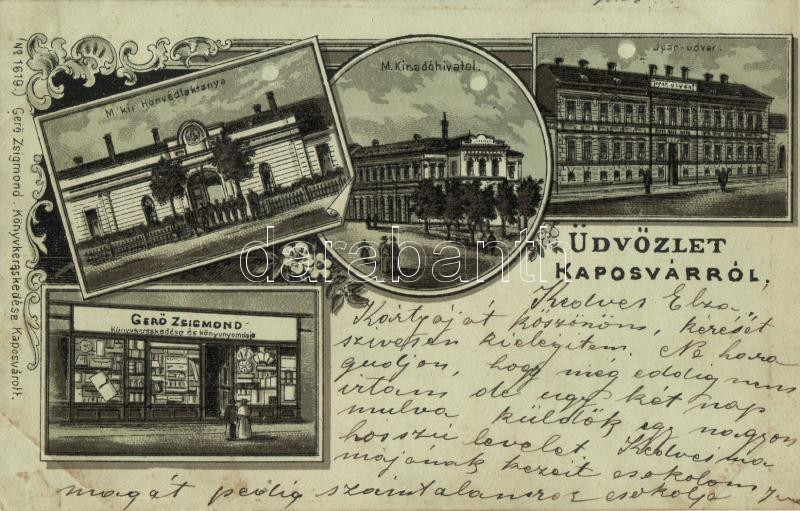 1899 Kaposvár, Honvédlaktanya, Adóhivatal, Ipar-Udvar, Gerő Zsigmond könyvkereskedése és könyvnyomdája és saját kiadású lapja, floral, litho
