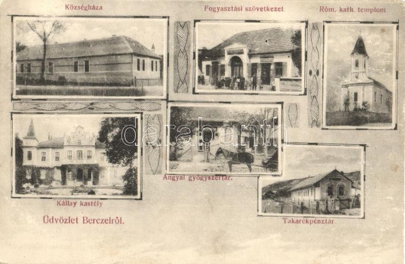 Leírás: Bercel, községháza, fogyasztási szövetkezet, Angyal gyógyszertár, Kállay kastély, római katolikus templom, takarékpénztár, Szilágyi Arthur kiadása (EK)