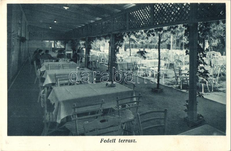 Budapest XIV. Thököly út 29. Schulcz Ferenc vendéglő-étterme, sportemberek találkozóhelye, fedett terasz, Klein Ernő kiadása (EB)