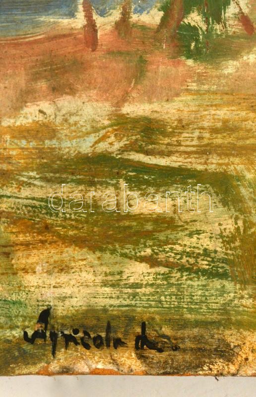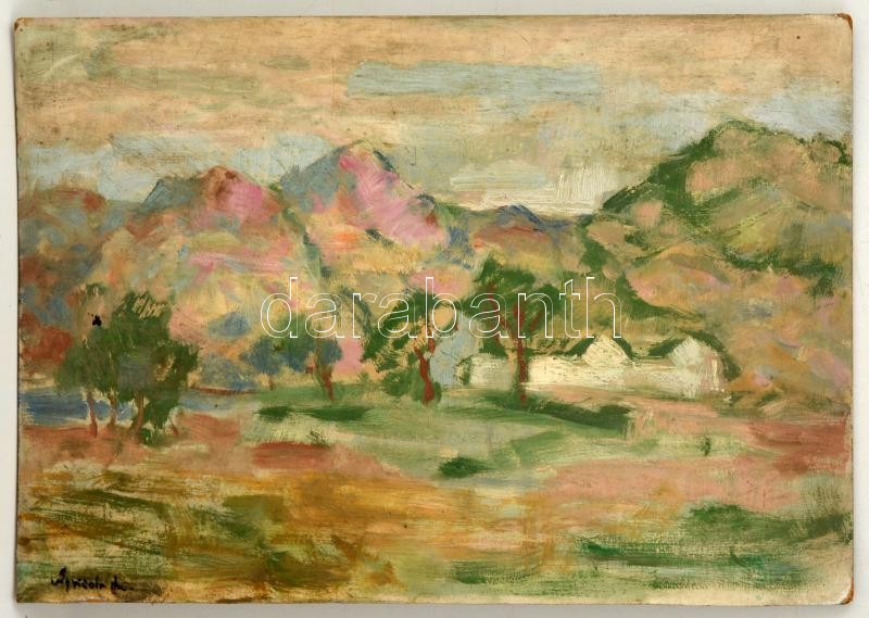 Leírás: Agricola jelzéssel: Hegyek, olaj, farost, sérült sarokkal 38×55 cm