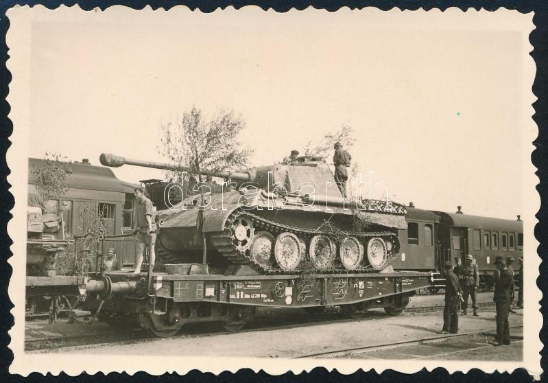 Leírás: cca 1943 Párduc harckocsi álcázása és szállítása vasúti kocsin, magyar pályaudvaron, 6x9 cm / Panther tank in Hungary
