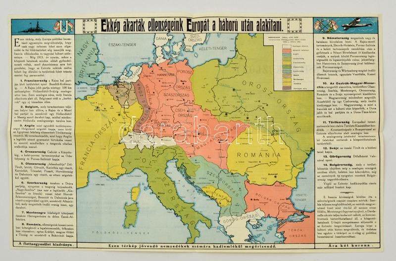 1916 Eképp akarták ellenségeink Európát a háború után alakítani. A Flottaegyesület kiadványa. Színes nyomtatvány új határokkal, melyek bizonyos tekintetben még optimistának is bizonyultak. 46x32 cm / This is how our enemies want to redraw Europe. Propaganda map.