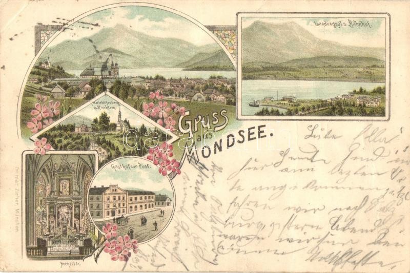 1895 (Vorläufer!) Mondsee, Landungsplatz und Banhof, Gasthof ur Post, Hochaltar, Mariahilferberg mit Kirchlein / port, railway station, guest house, church interior. floral, litho (fa)