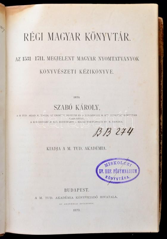 Szabó Károly: Régi magyar könyvtár. I. kötet. Az 1531-1711. megjelent magyar nyomtatványok könyvészeti kézikönyve. Bp., 1879, MTA, XIV+751 p. Korabeli félbőr-kötés, kopottas borítóval, sérült,(rosszul, amatőr módon) javított gerinccel, de belül jó állapotban.
