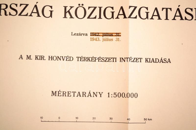 1943 Magyarország közigazgatási térképe a visszacsatolt részekkel. Nagyméretű térkép két részből. Jó állapotban. Honvéd Térképészeti Intézet. 180x104 cm