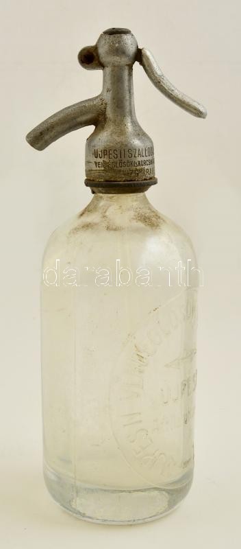 Leírás: Szódásüveg Ujpesti Vendéglősök Szikvízgyára felirattal az üvegen és a fejen is / Soda bottle