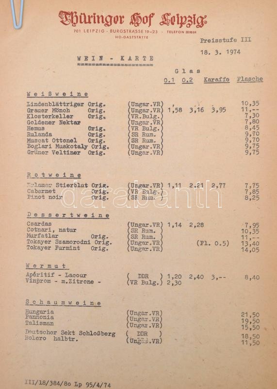 1971-1974 6 db különböző étlap, többek közt: Ezerjó vendéglő, Centrál vendéglátó, Thüringer Hof leipzig