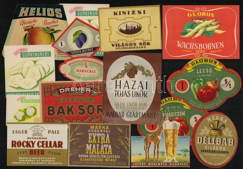 cca 1940-1970 Vegyes ital- és konzervcímke tétel, összesen 35 db, köztük Kőbányai Extra Maláta, Dreher Bak sör, Globus, 9,5x8 és 9x13 cm közti méretben