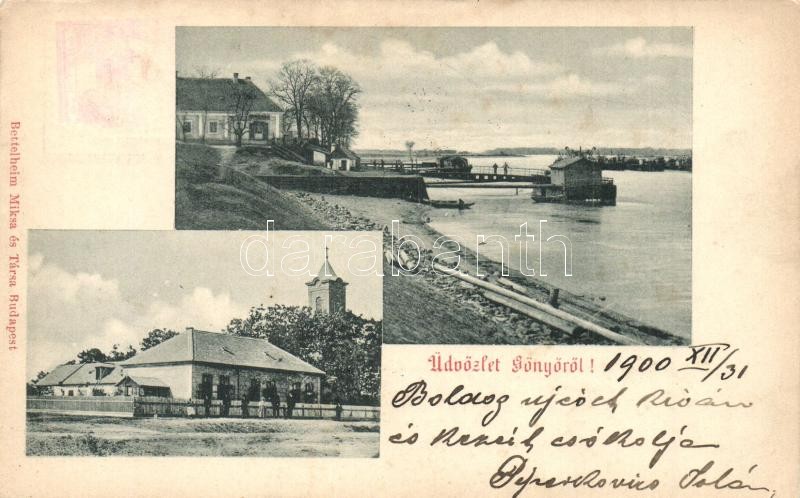 Leírás: Gönyű, Gönyő; Római katolikus templom és plébánia, hajóállomás, vízi hajómalom. Bettelheim Miksa és Társa (ázott sarok / wet corner)