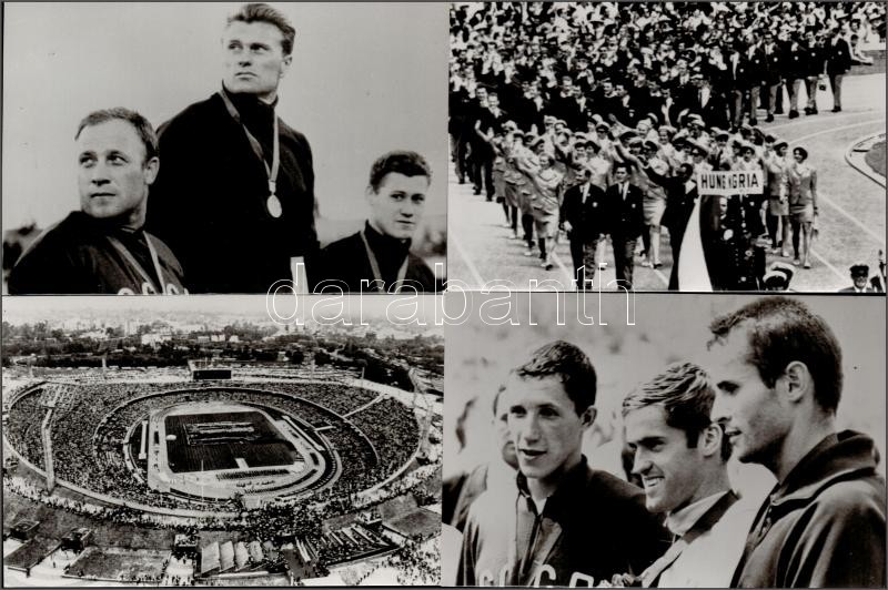 1968 Mexikói Olimpia. Kalapácsvetés, magyar csapat a megnyitó ünnepségen, öttusa. Képzőművészeti Alap kiadása / Summer Olympics in Mexico City. Hungarian national team at the ceremonial opening, pentathlon, hammer throwing - 4 db modern képeslap / 4 modern postcards
