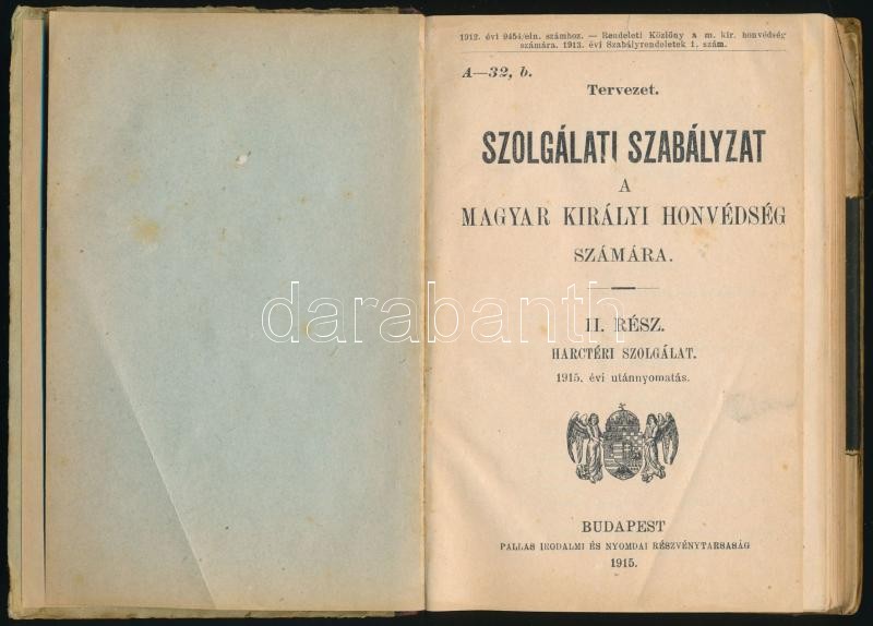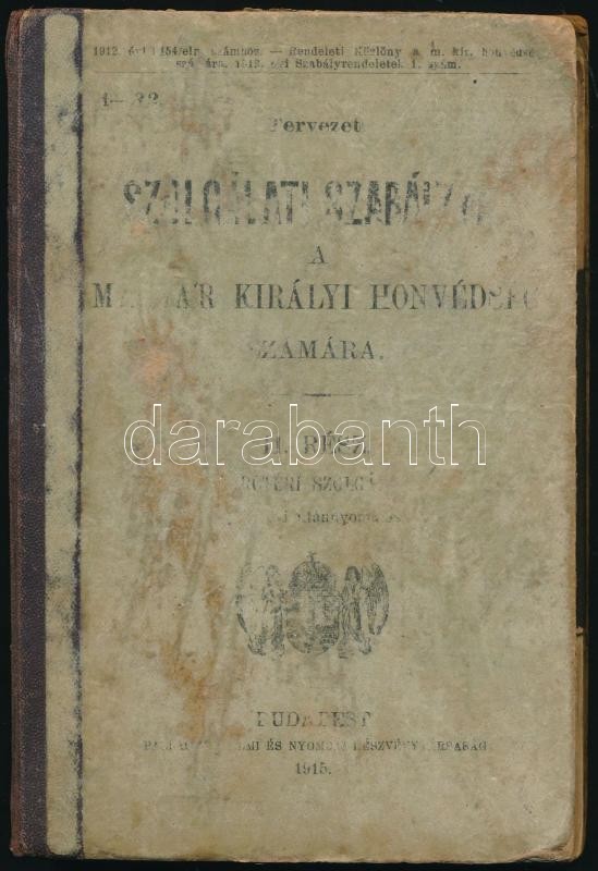 Leírás: Szolgálati szabályzat a Magyar Királyi Honvédség számára. II. rész. Harctéri szolgálat. Bp., 1915, Pallas. Félvászon kötés, kopottas állapotban.