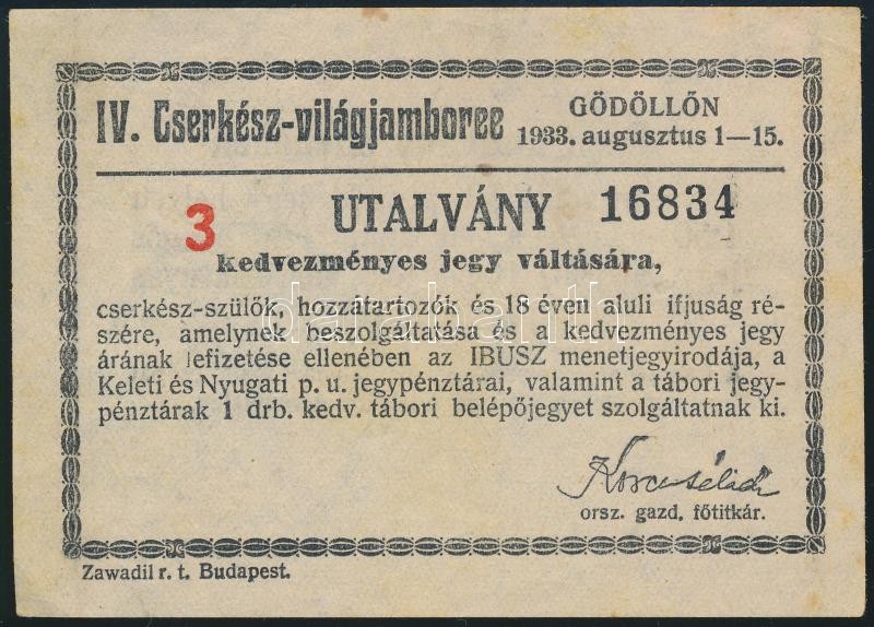 1933 Gödöllő Jamboree utalvány kedvezményes jegy vásárlására / 1933 Gö... https://www.darabanth.com/hu/31-Nagyaukcio/31.1/Festmeny-mutargy-papirregiseg-egyeb/Cserkesz~12795/1933-Godollo-Jamboree-utalvany-kedvezmenyes-jegy-vasarlasara-1933-Godollo-Jamboree-vou~II1919570