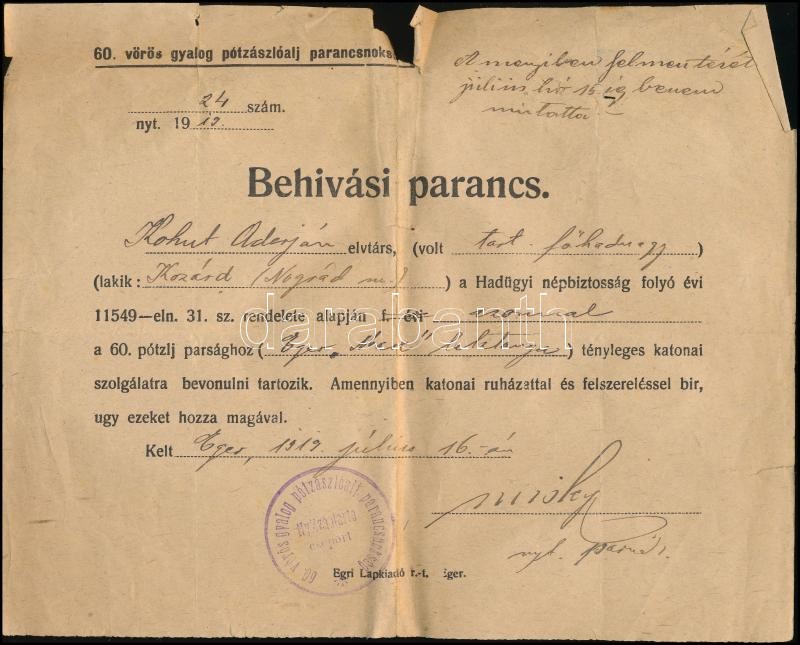 1919 Eger, 60. vörös gyalog pótzászlóalj parancsnokságának behívási parancsa, 1919. július 16., pecséttel, aláírással, szakadással, hajtásnyommal.