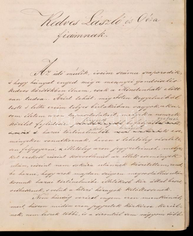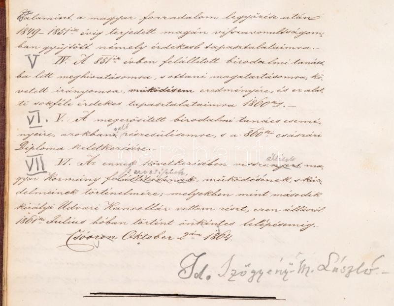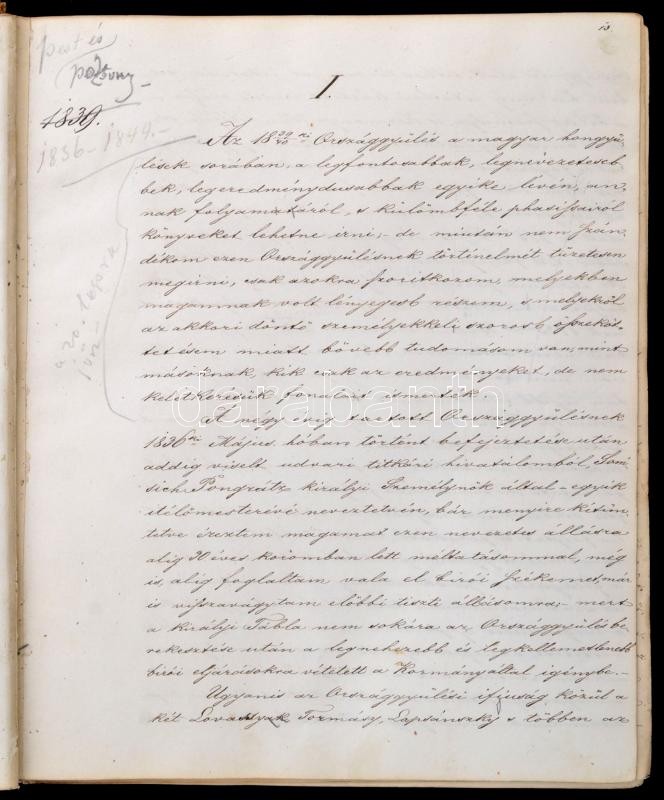 1864 Id. magyarszőgyéni és szolgaegyházi Szőgyény-Marich László (1806-1893): Emlékiratai I. kötetének eredeti, saját kezűleg írt kézirata, benne Thallóczy Lajos (1857-1916) politikus, történész, levéltáros ceruzás javításaival. Későbbi félbőr-kötésben, kopott borítóval, javított kötéssel, néhány foltos lappal, 648 kézzel számozott oldal. Szőgyény-Marich László (1806-1893): jogász, konzervatív politikus, császári és királyi kamarás, valóságos belső titkos tanácsos, az utolsó udvari kancellár, amely tisztségéről 1848-ban lemondott.
