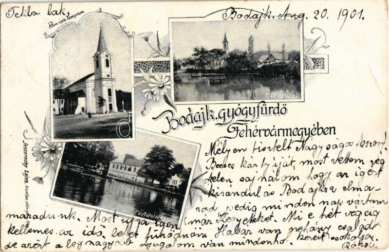 Leírás: 1901 Bodajk-gyógyfürdő, Római katolikus templom, Tófürdő, fürdőház. Jeszenszky Lajos kiadása, Art Nouveau, floral (EK)