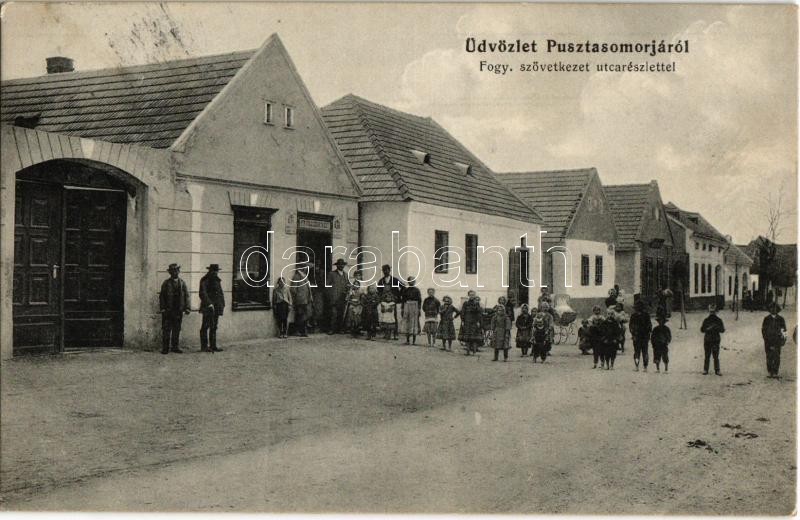 Leírás: 1912 Pusztasomorja (Jánossomorja), utcakép, fogyasztási szövetkezet üzlete és saját kiadása