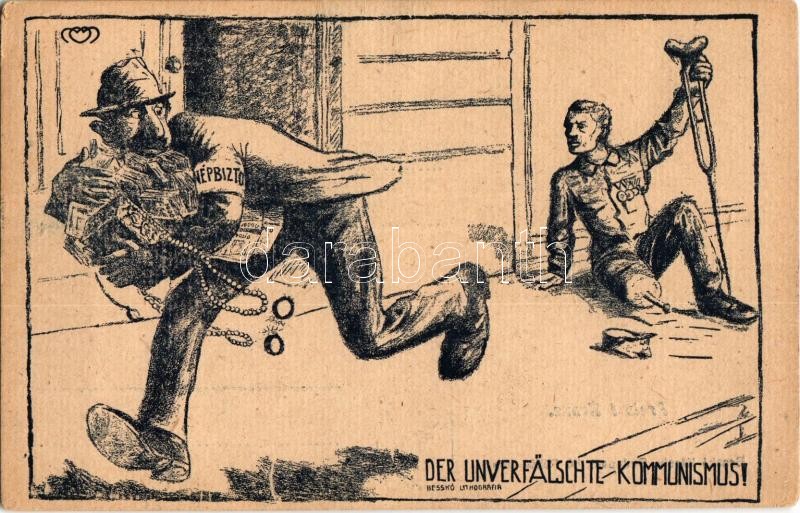 Leírás: Der Unverfälschte Kommunismus! / Népbiztos és hadirokkant, kommunizmus ellenes (antikommunista) propaganda lap, Besskó Károly Lithografia / Hungarian Anti-Communist propaganda art postcard