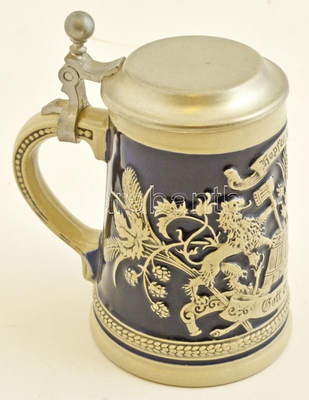 Ón fedeles díszes söröskorsó, mázas kerámia, jelzett, kis kopásokkal, ...
