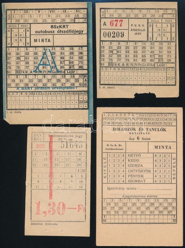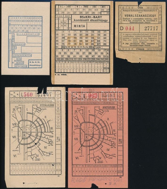 Budapesti közlekedési jegyek (FVKV, BKV, BSzKRt, stb.), 9 db https://www.darabanth.com/hu/310-Gyorsarveres/310.0/Festmeny-mutargy-papirregiseg-egyeb/Okmanyok~17/Budapesti-kozlekedesi-jegyek-FVKV-BKV-BSzKRt-stb-9-db~II1691186