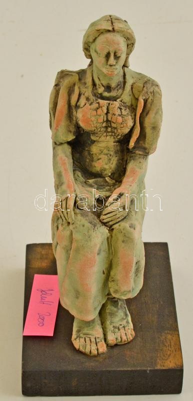 Leírás: Ülő nő, kerámia szobor, jelzett, fa talapzaton, m: 16,5 cm