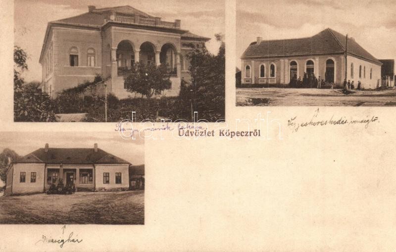 Leírás: Köpec, Capeni (Barót, Baraolt); Bányamérnök lakása, Vendéglő és üzlet, étterem, Községháza. Drotleff Jos. műintézet, Koszta Károly fényképész kiadása / mine engineer's villa, shop and restaurant, town hall (ázott sarok / wet corner)