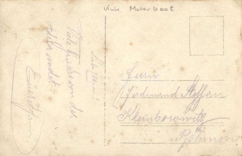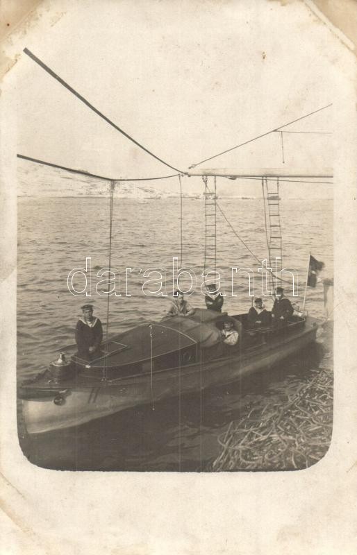Osztrák-magyar hadihajóról leeresztett motorcsónak, a kötélhágcsókkal melyekről a tengerészek leereszkedtek / K.u.K. Kriegsmarine Motorboot / Austro-Hungarian motorboat and rope ladders (that the mariners used to descend onto the motorboat). photo