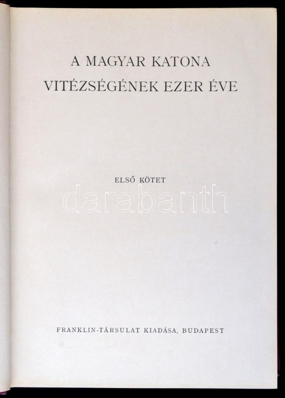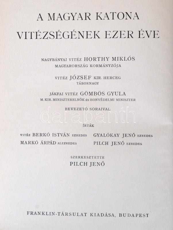 Pilch Jenő (szerk.): A magyar katona vitézségének ezer éve I-II. kötet. Budapest, é.n. [1933], Franklin-Társulat, XVI+484+503 p. Kiadói aranyozott egészvászon kötés, képekkel, térképekkel illusztrált. Jó állapotban