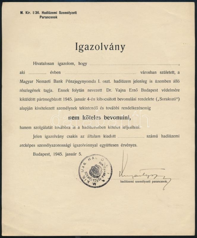 Leírás: 1945 Bp., Kitöltetlen igazolvány hadiüzemi dolgozó részére, mely felment a bevonulási kötelezettség alól