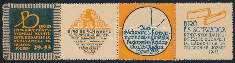 1910 Bíró és Schwarz Könyvnyomdai Műintézet 4 klf levélzáró négyescsík...