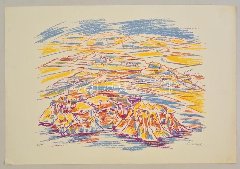 Leírás: Szilárd Klára (1921- ): Hegyvidék, színes szitanyomat, papír, jelzett, számozott (33/75), 38×56 cm