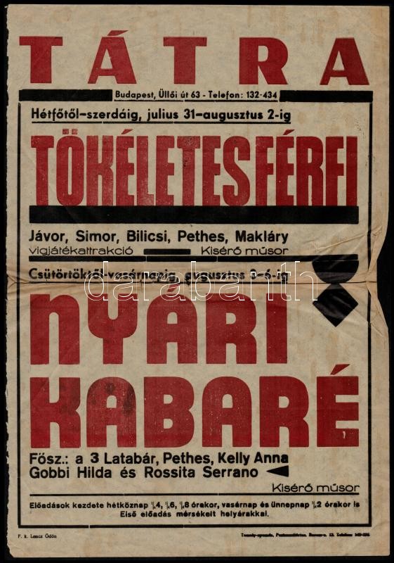 cca 1939 Tátra mozi, Tökéletes férfi, Nyári kabaré filmeket hirdető plakát, főszerepekben: Jávor, Latabár, Pethes, Gobbi Hilda, hajtásnál szakadások, 41,5x29 cm