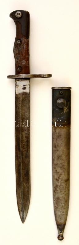 Leírás: cca 1910 Waffenfabrik Neuhausen bajonett, jelzett, hüvelyen kis hibával, h:37,5 cm
