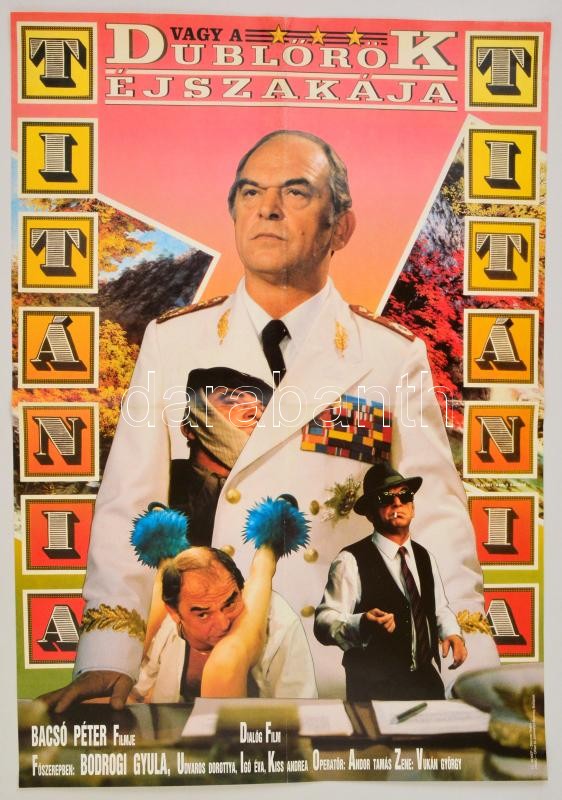 1988 Vasvári Sándor László (1952-): Titánia, Titánia, avagy a dublőrök éjszakája, magyar film plakát, rendezte: Bacsó Péter, főszerepben: Bodrogi Gyula, hajtásnyommal, 81x56,5 cm