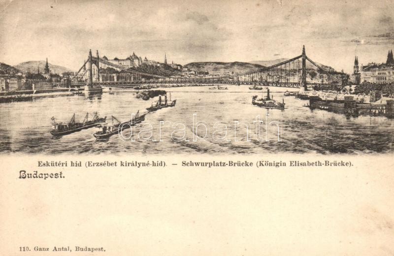 Budapest, Eskü téri híd (Erzsébet királyné híd), gőzhajók. Ganz Antal ...