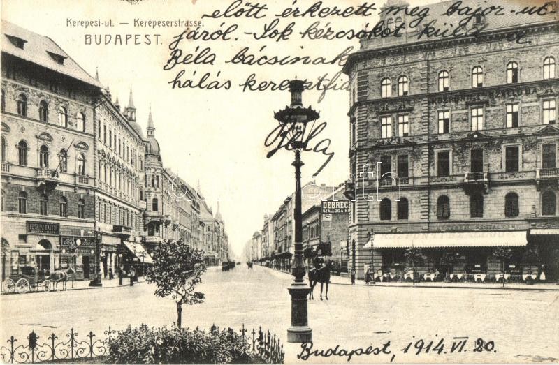 Leírás: 1914 Budapest VIII. Kerepesi út, Petrits Károly hentesüzlete, Központi és Debreczen szálloda, órás és ékszerész (EK)