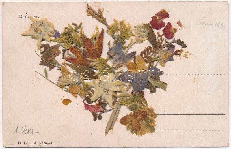 Leírás: Budapest I. Királyi vár. Magyar zászlós, virágos keret. Hátoldalon szárított élő virág (EK)