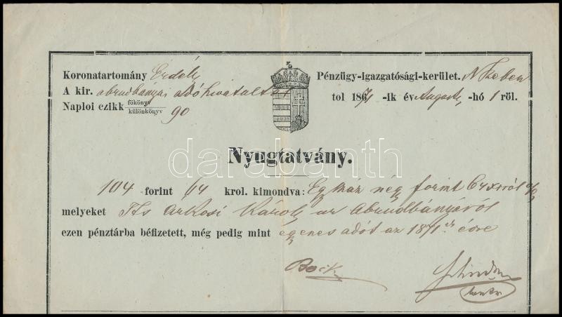 1871 Az abrudbányai (Erdély) adóhivatal által Dálnoki Árkosy Károly (1820-1881) törvényszéki bíró bányaigazgatósági tag részére kiállított nyugtatvány a befizetett adóról