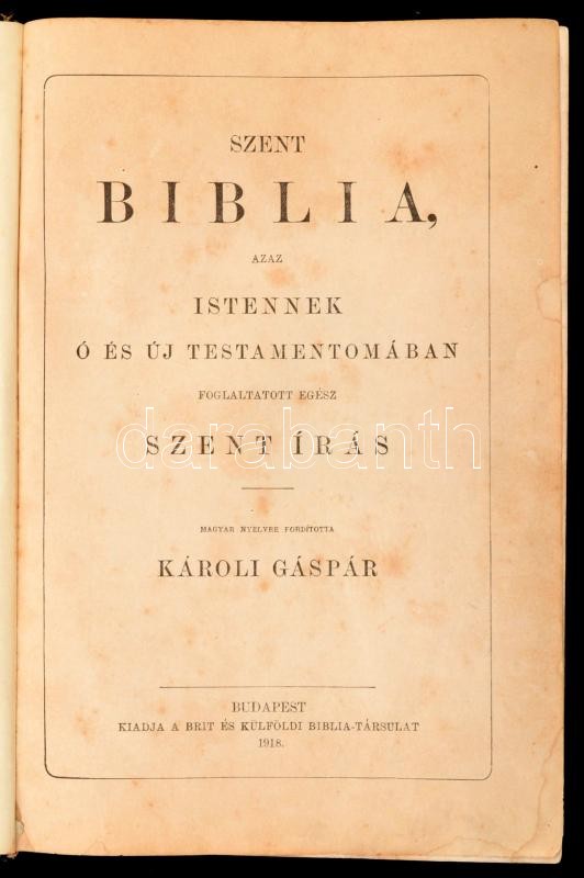 Szent Biblia. Fordította: Károli Gáspár. Bp., 1918, Brit és Külföldi Biblia-Társulat. Kiadói félvászon-kötés, kopott borítóval, sérült gerinccel, ceruzás bejelölésekkel, az utolsó lapon családi bejegyzéssel.
