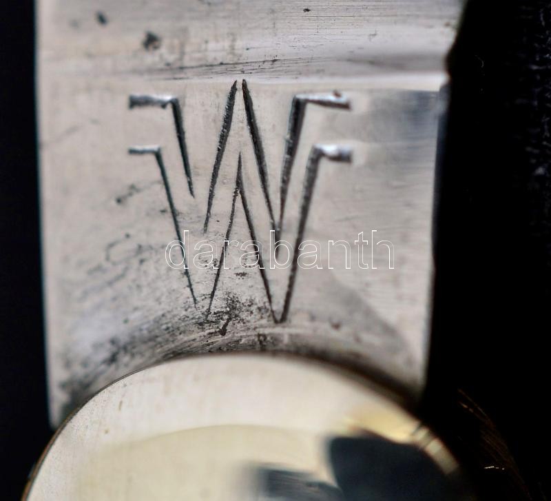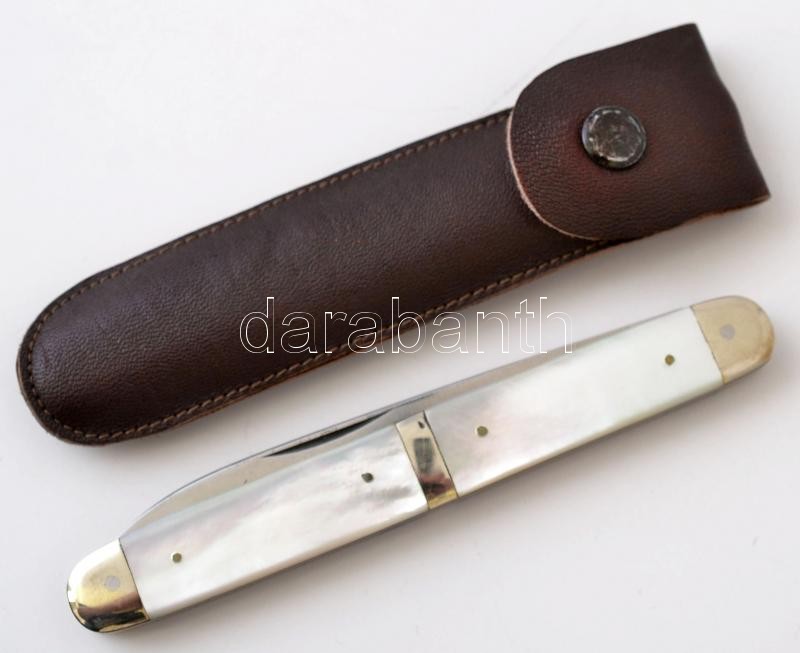 Leírás: Wilhelm Wagner Solingen rozsdamentes nyelű szalonnázó zsebkés, jelzett, eredeti gyöngyház nyéllel, rézbetétes, alpakka paklival, bőr tokkal, két pengés, h: 21,5 cm