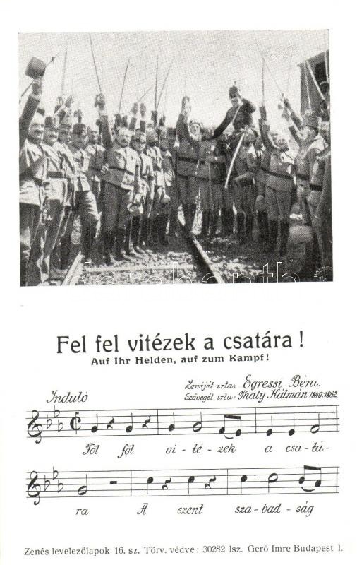 Fel fel vitézek a csatára! Zenéjét írta: Egressy Béni, szöveg: Thaly Kálmán; kotta. Zenés levelezőlapok 16. sz. / WWI Austro-Hungarian K.u.K. military sheet music
