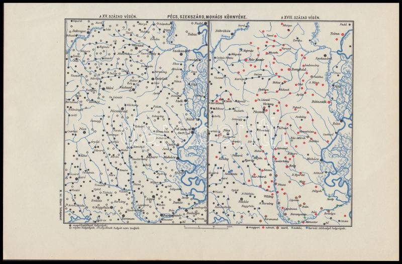 Leírás: Pécs, Szekszárd, Mohács környéke a XV. / XVIII. század végén, térkép, M. kir. Állami Térképészet, 15×23,5 cm