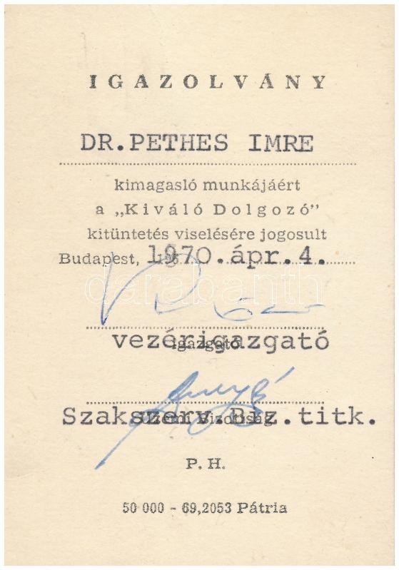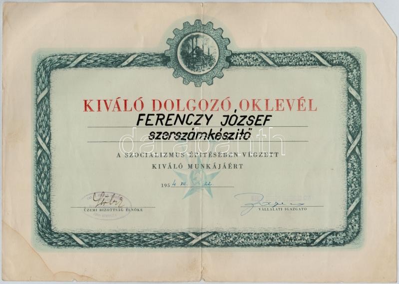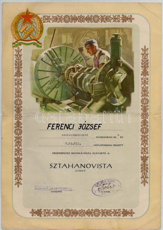 1954. "Kiváló Dolgozó" oklevél + "Sztahanovista" oklevél + 1970. "Kivá... https://www.darabanth.com/hu/334-Gyorsarveres/334.0/Numizmatika/Falerisztika-Kituntetesek-jelvenyek~500017/1954-Kivalo-Dolgozo-oklevel-plus-Sztahanovista-oklevel-plus-1970-Kivalo-Dolgozo-viselesre~II1874785