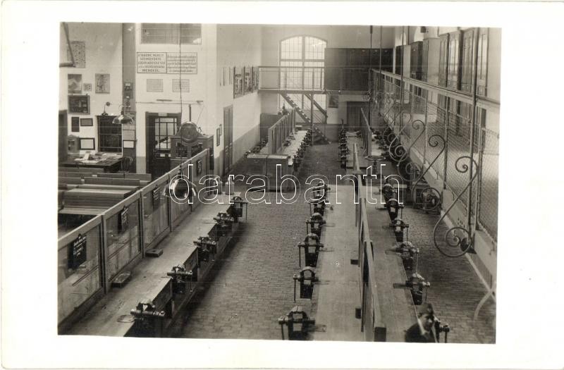 Leírás: 1943 Debrecen, Vagongyár, tanműhely, belső "A tanonc műhely személyzete légiriadó esetén a 4. sz. búvóárokba menekül" táblával a falon. photo