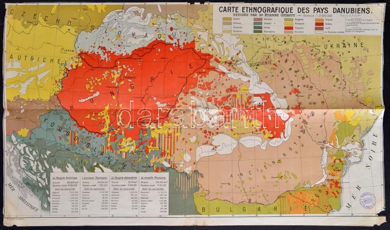 cca 1928 Carte Ethnografique Des Pays Danubiens. A dunai országok néprajzi térképe. Összeállította: Dr. Györffy István. 1:2.000,000. Bp., M. Kir. Állami Térképészet, francia nyelven, a széleken kis sérülésekkel, 37x63 cm. Ritka!