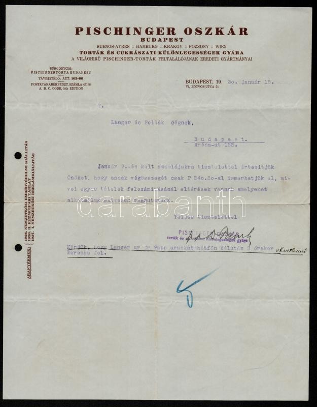 1930 Budapest, Pischinger Oszkár torták és cukrászati különlegességek ... https://www.darabanth.com/hu/337-Gyorsarveres/337.0/Mutargy-papirregiseg-egyeb/Okmanyok~500017/1930-Budapest-Pischinger-Oszkar-tortak-es-cukraszati-kulonlegessegek-gyara-fejleces-szam~II1887906
