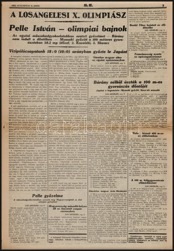 1932 A X. nyári olimpiai, Los Angeles-i olimpiai játékokról szóló újságcikk, benne az esemény híreivel, közte a Vízilabda válogatott győzelmével, és Pelle István olimpiai bajnoki címével, szakadással, 5-8 p.
