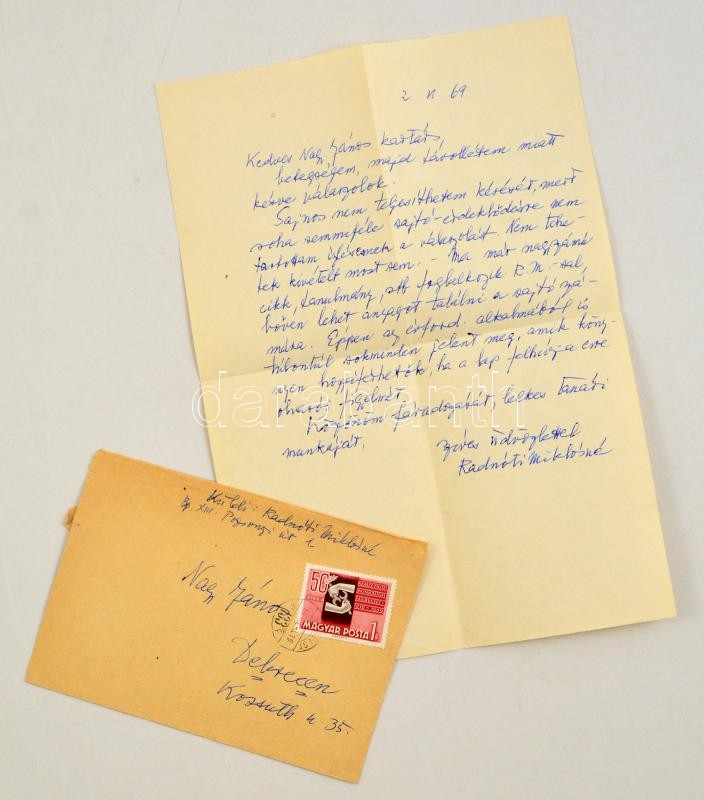 Radnóti Miklósné Gyarmati Fanni (1912-2014) sajét kézzel írt levele Nagy János újságírónak, melyben elutasítja a Radnóti Miklós évforduló kapcsán kapott sajtómegkeresést. Borítékkal