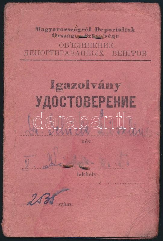 1945 Magyarországról Deportáltak Országos Szövetsége által kiállított ... https://www.darabanth.com/hu/339-Gyorsarveres/339.0/Mutargy-papirregiseg-egyeb/Judaika~500024/1945-Magyarorszagrol-Deportaltak-Orszagos-Szovetsege-altal-kiallitott-fenykepes-igazolva~II1906848