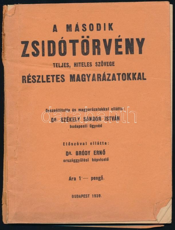 A II. zsidótörvény teljes, hiteles szövege részletes magyarázatokkal. Összeállította és magyarázatokkal ellátta: Székely Sándor. Előszóval ellátta: Bródy Ernő.