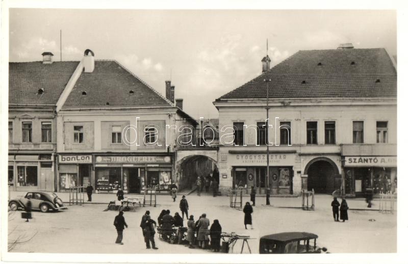 Rozsnyó, Roznava; Rákóczi tér, Bonton, Szántó A. üzlete, piaci árusok, drogéria, Gyógyszertár a Szentháromsághoz, automobil. Kiadja Fuchs József / square, shops, market vendors, pharmacy, automobile